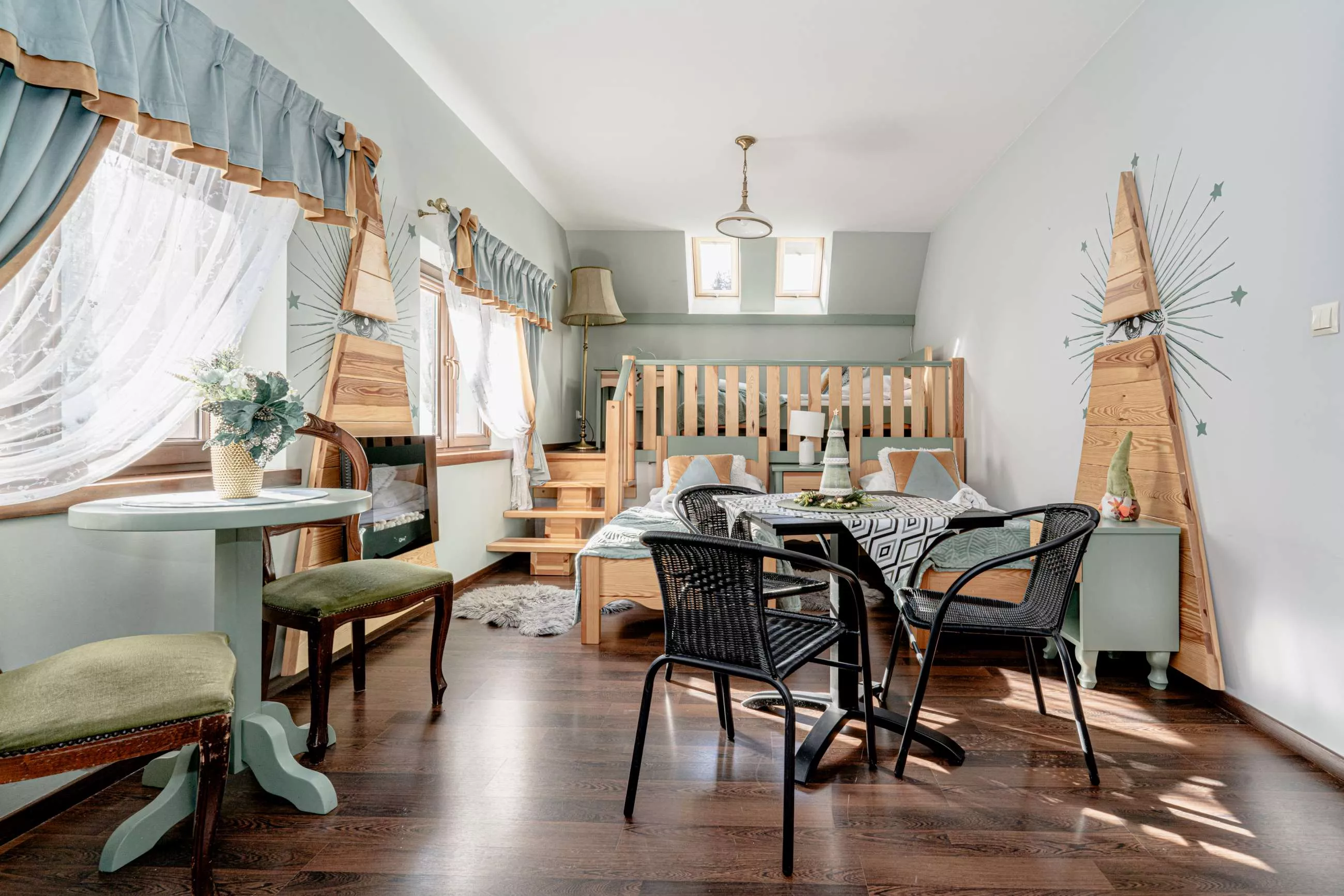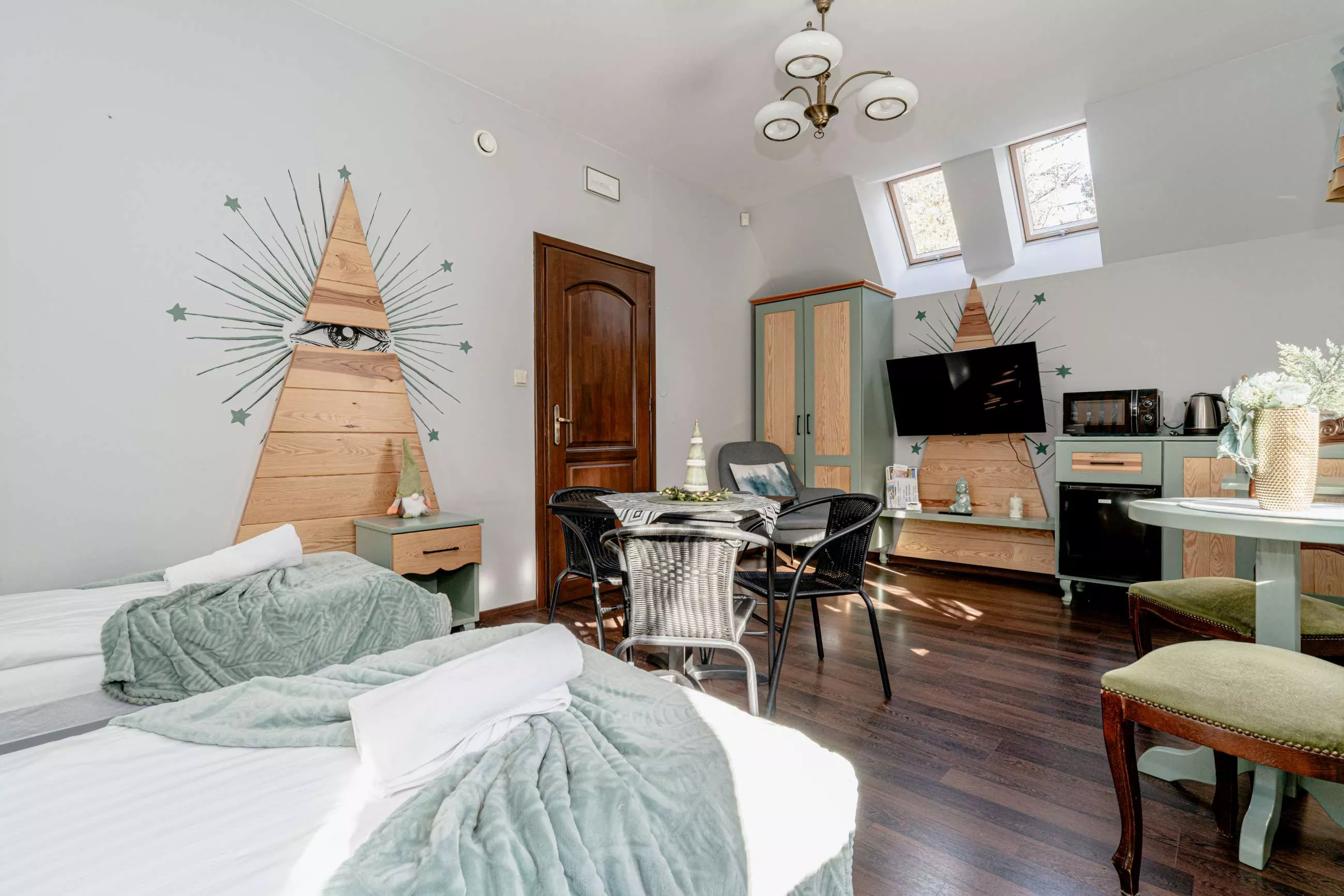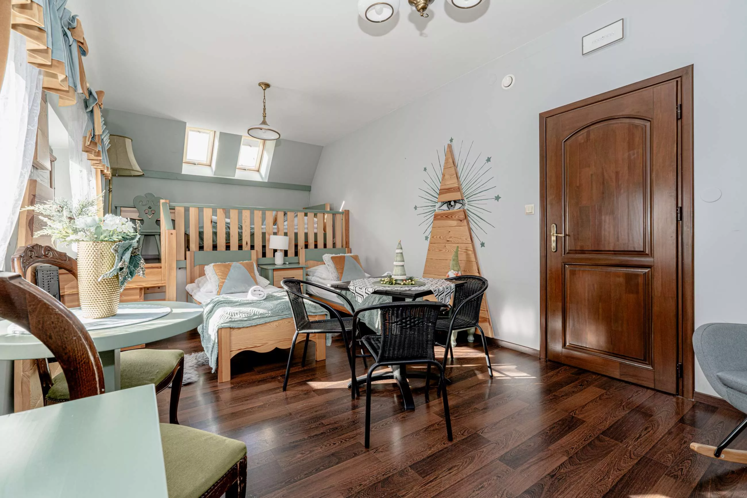 Apartament składa się z: dużej sypialni z antresolą, z 3 wygodnymi łóżkami (z czego 2 można połączyć w łoże małżeńskie), aneksu kuchennego hotelowego z lodówką, czajnikiem i niezbędnymi naczyniami.