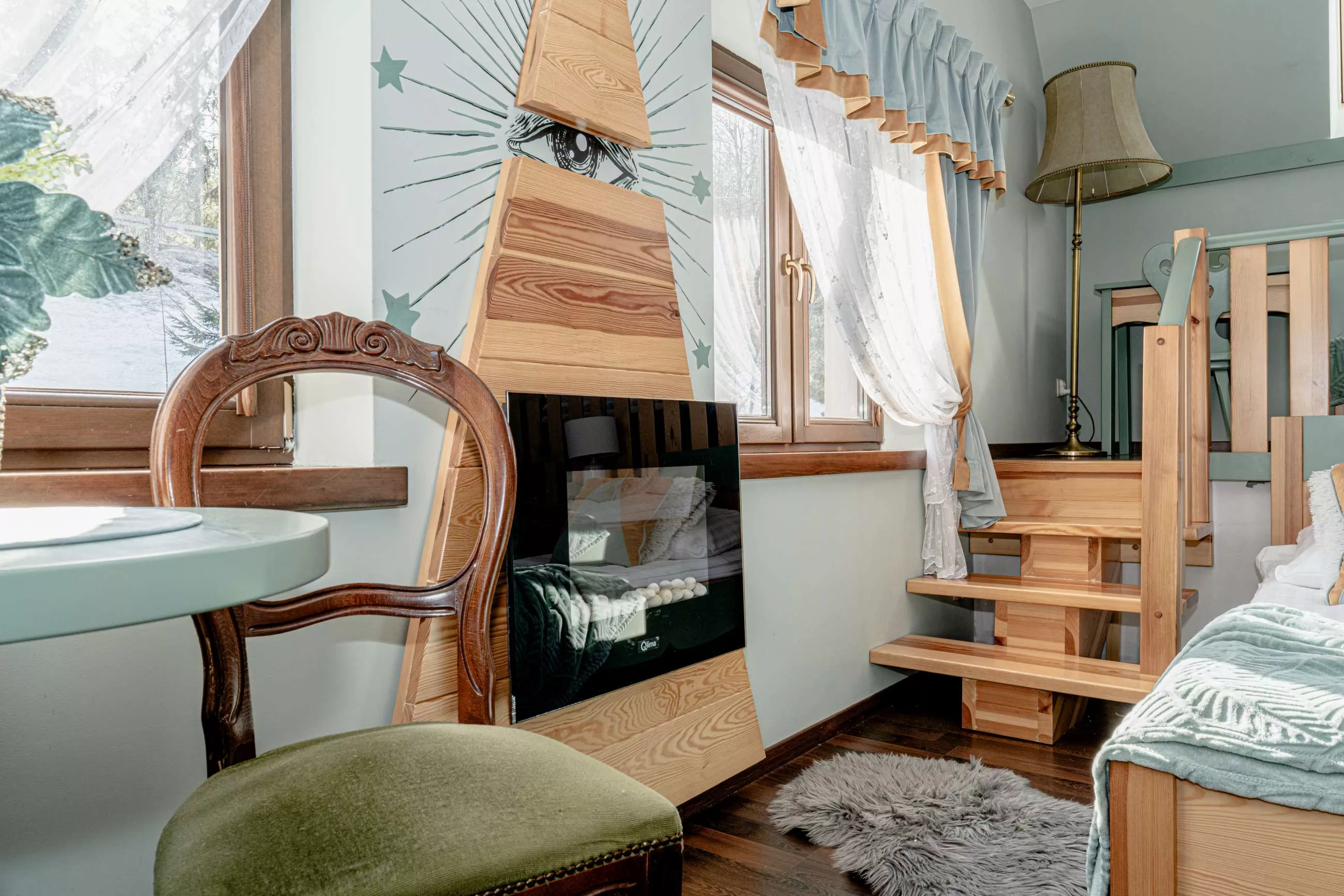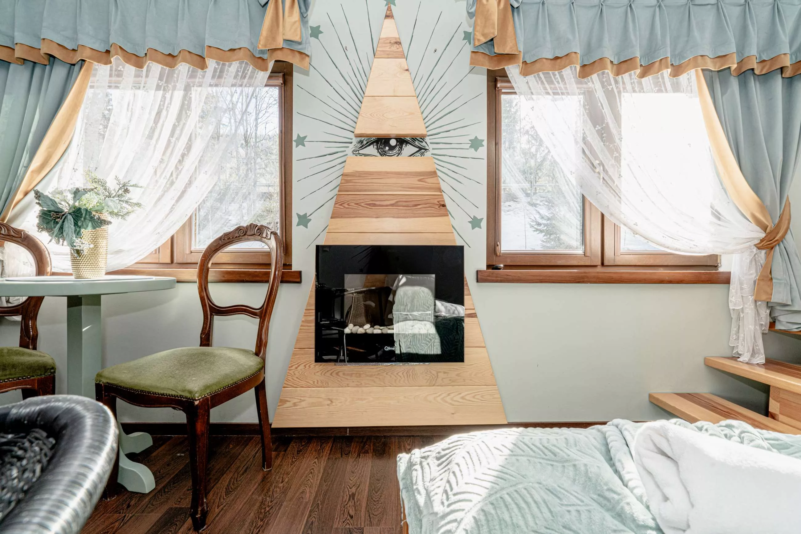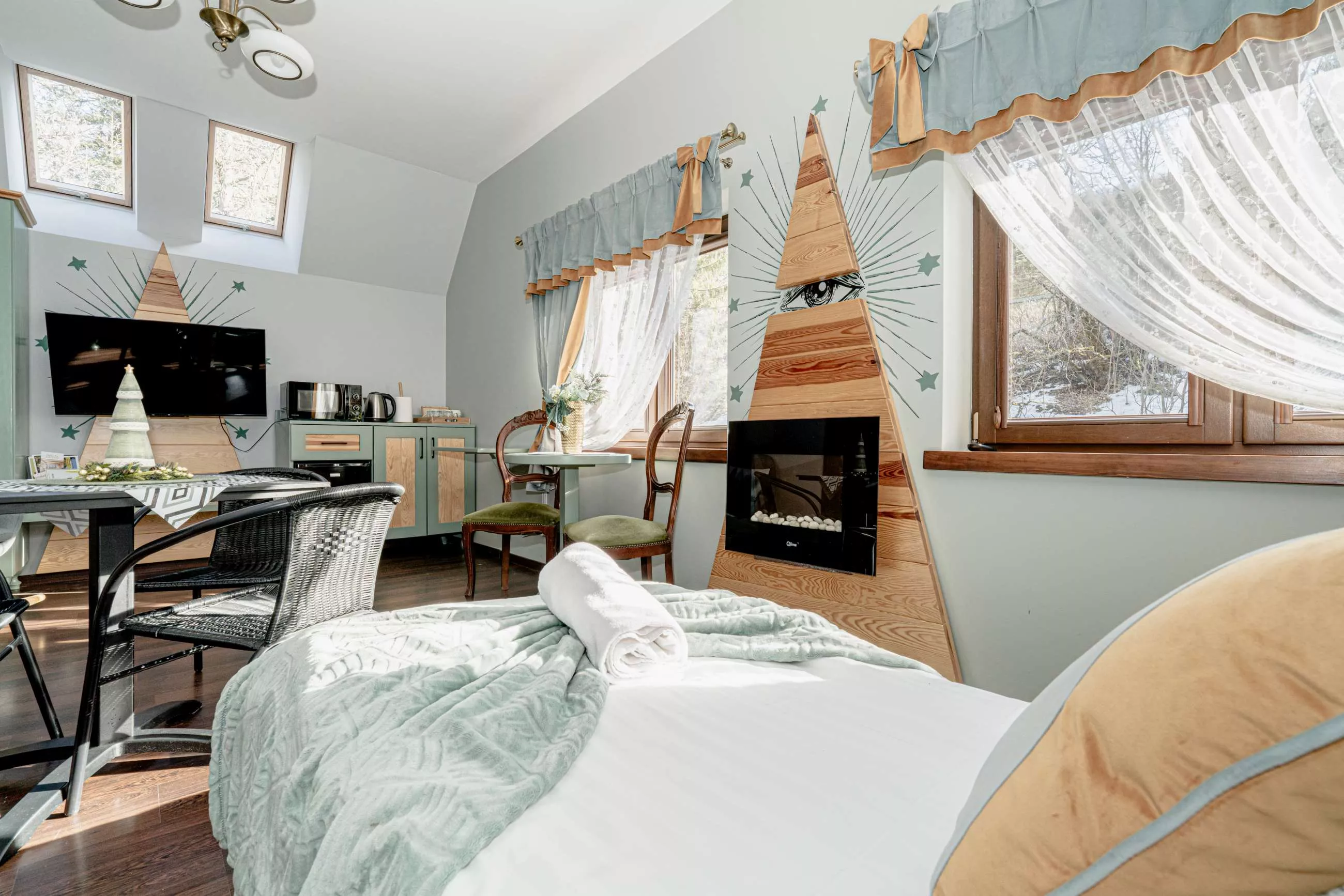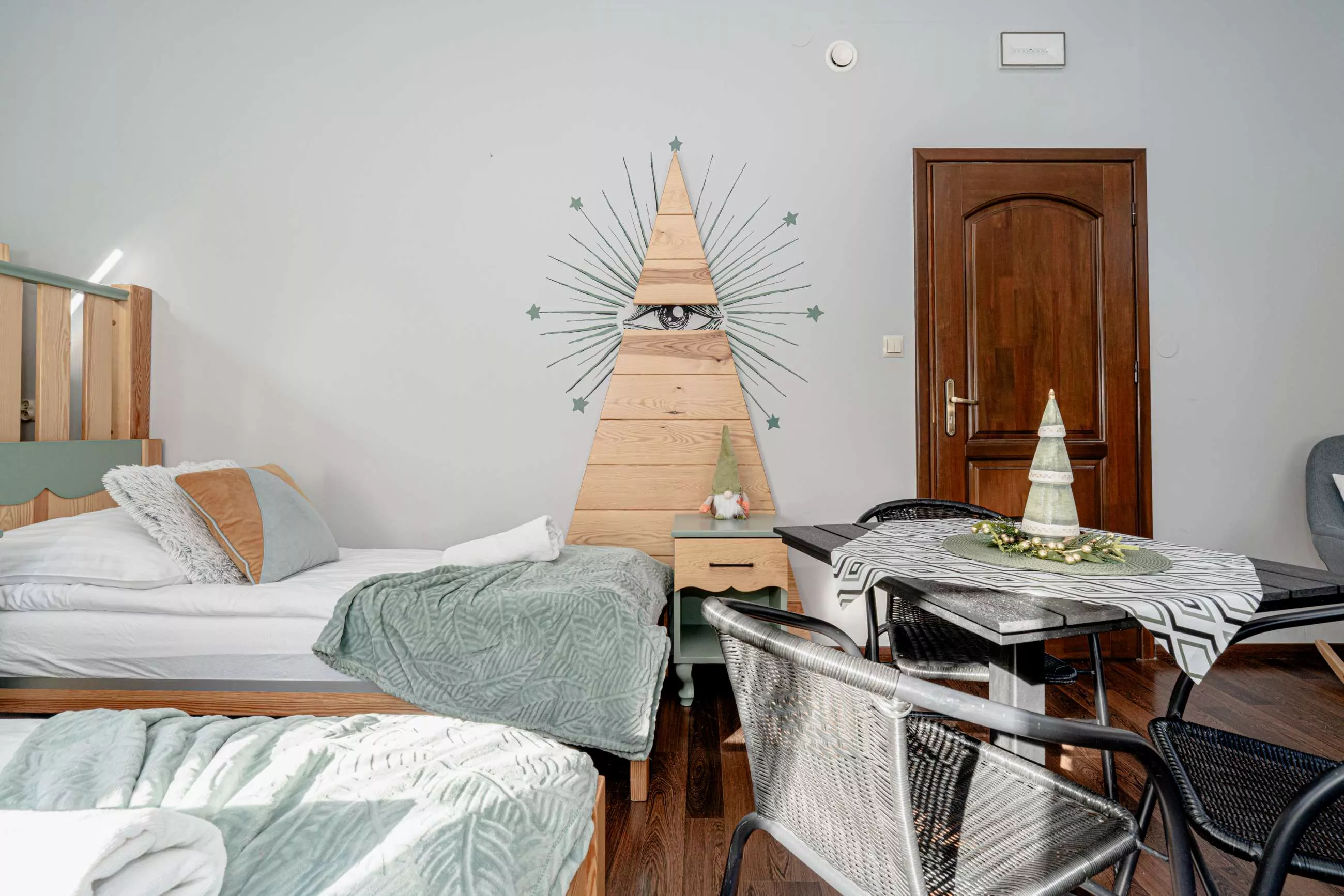 PIRAMIDY pod Giewontem to uroczy apartament zaprojektowany w kolorze zielonych wiosennych pędów świerka wyposażony w drewniane artystyczne meble wykonane na zamówienie. Ściany zdobią drewniane piramidy.