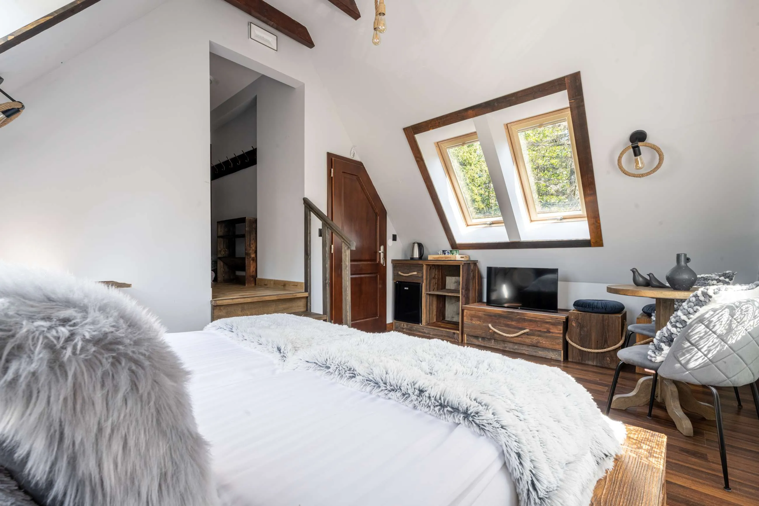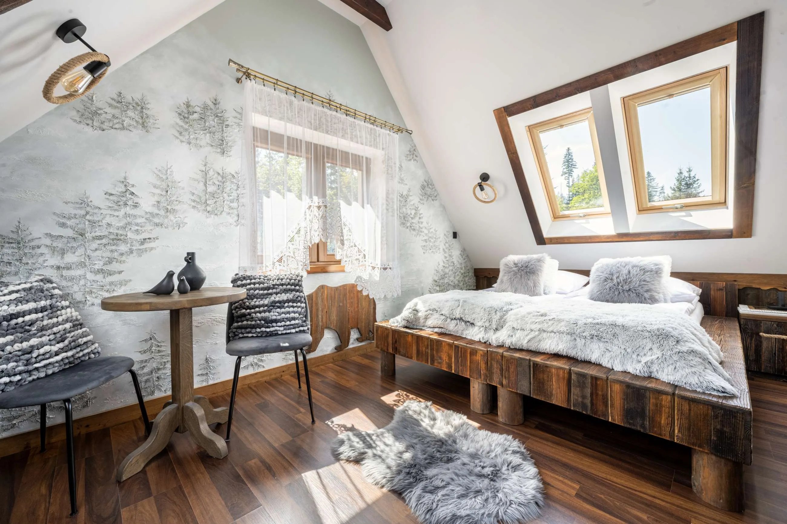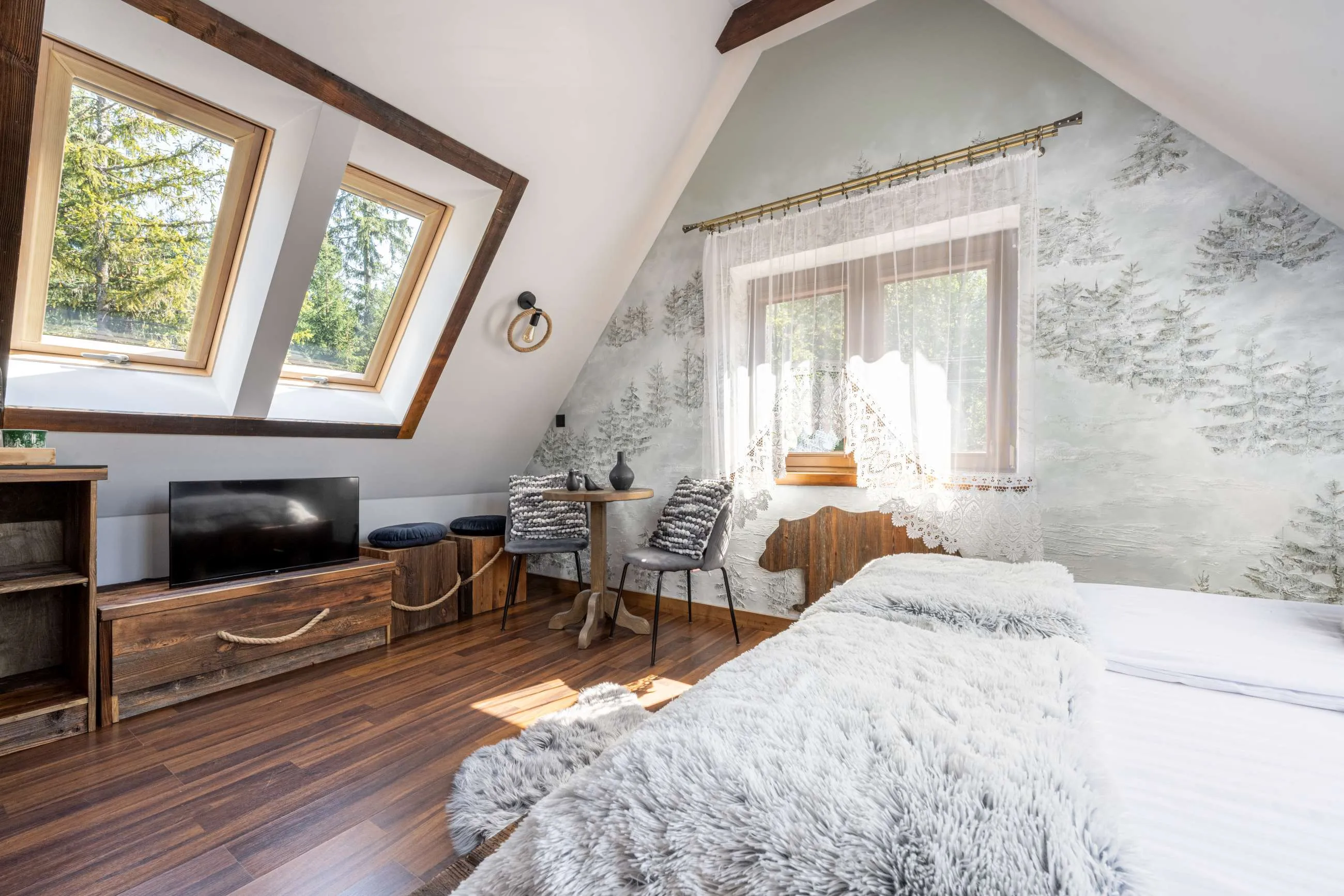 Wnętrza apartamentów zostały zaprojektowane w stylu inspirowanym naturą Tatr. Drewniane meble, naturalne materiały oraz dekoracje z motywami fauny i flory tworzą przytulną atmosferę sprzyjającą wypoczynkowi.