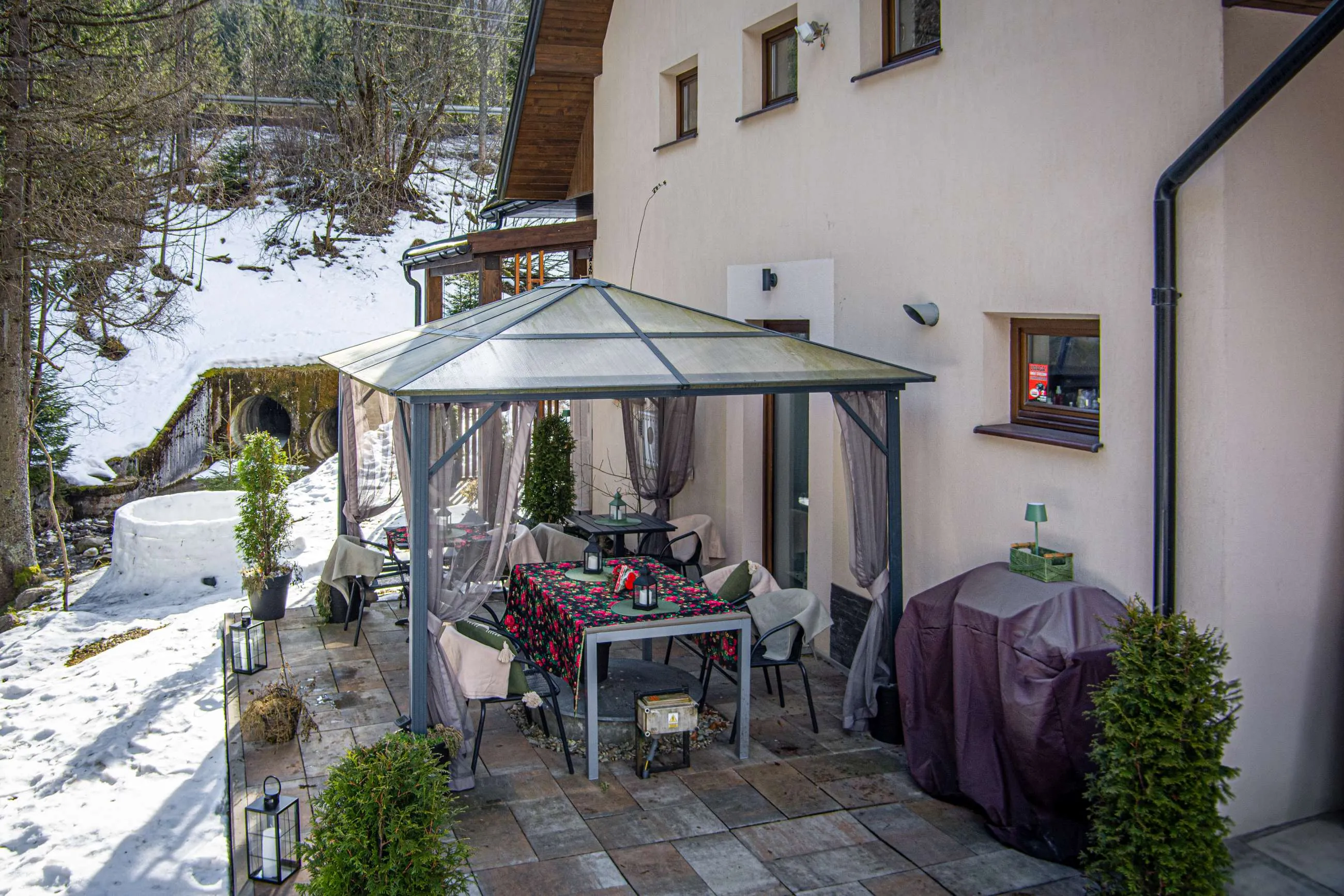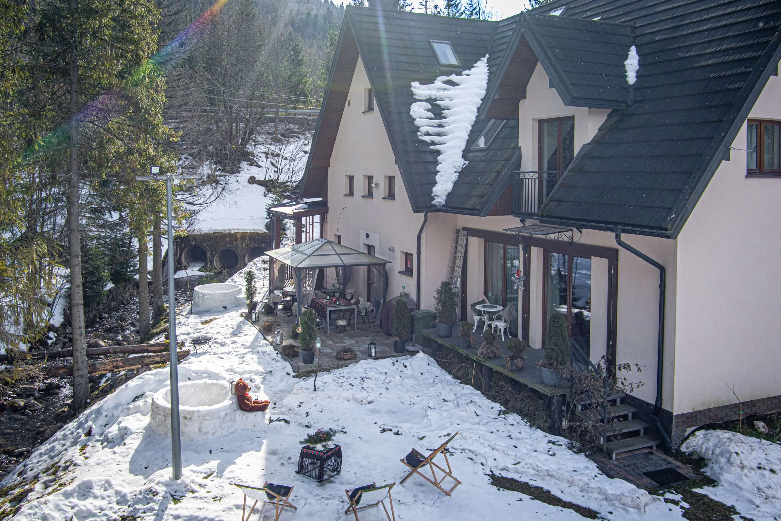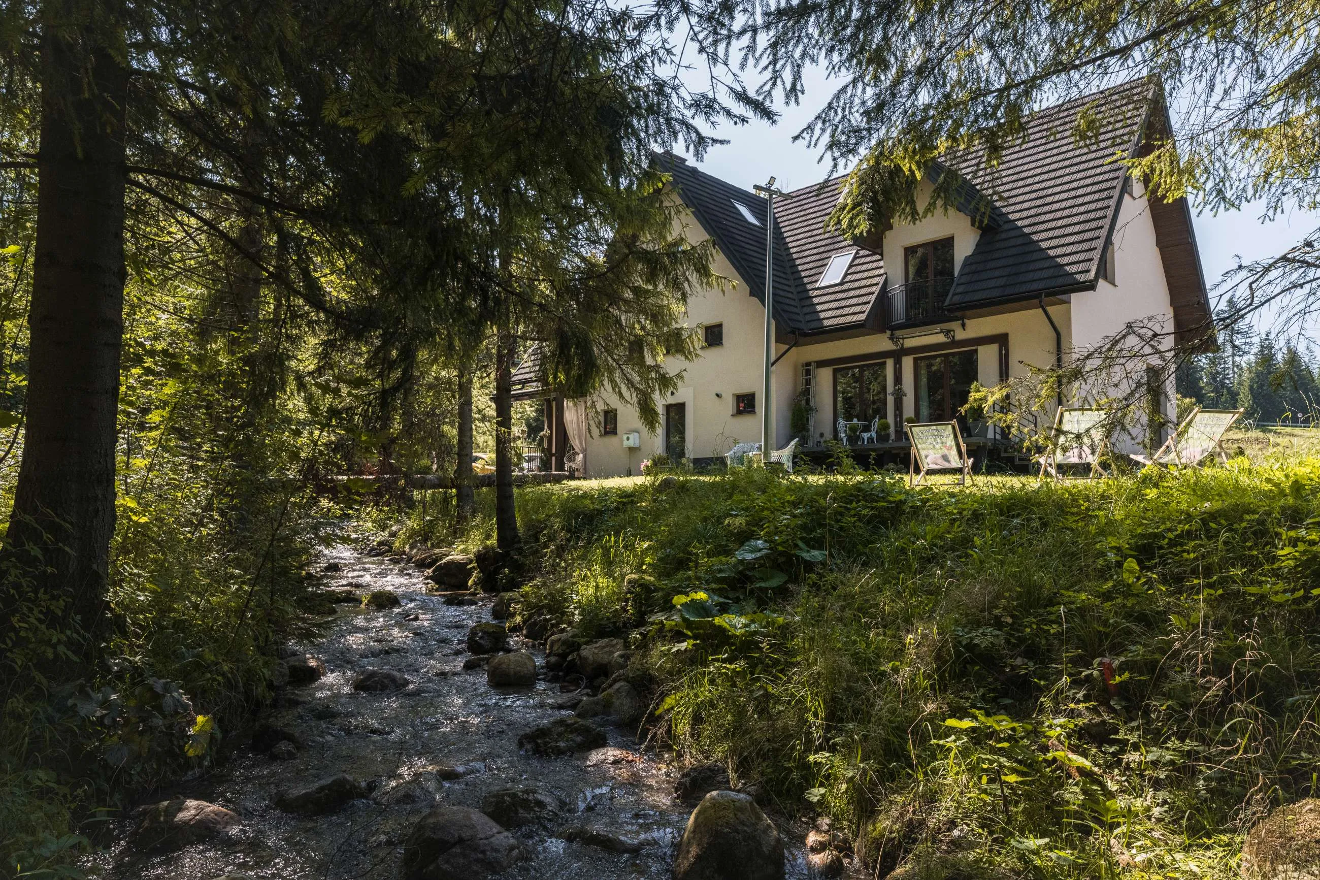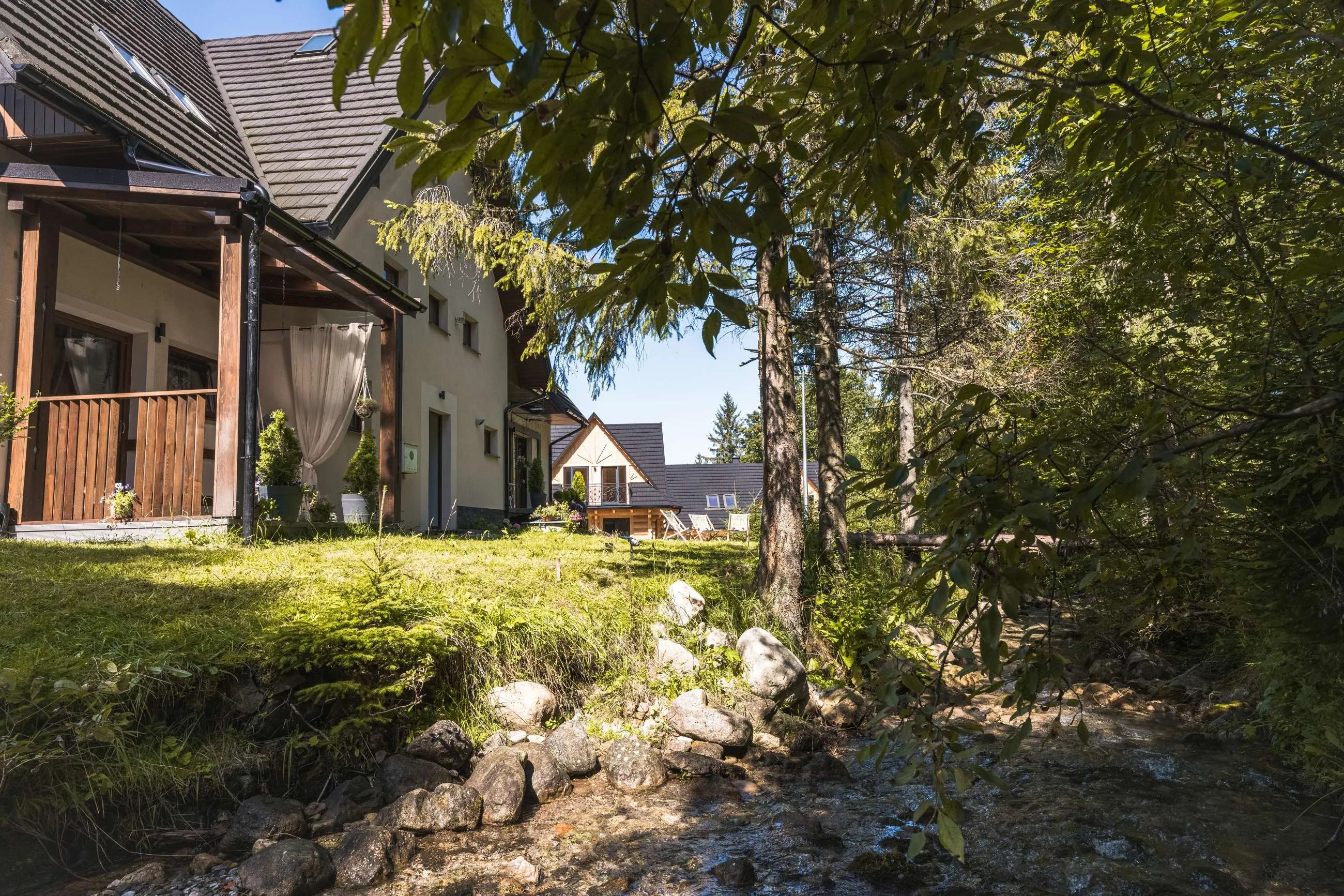 Jednym z najbardziej wyjątkowych miejsc w Rezydencji są tarasy położone tuż nad górskim potokiem. Szum wody, zapach świerków i widok na las tworzą idealne warunki do odpoczynku.